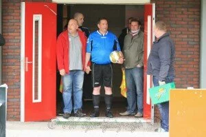 Scheidsrechter Boers begeleidt hier pupil van de week Karel Hilbrands. Naast Boers staan zijn assistenten Nurmela en Van der Aa. Rechts in beeld verzorger Ouwe Gek